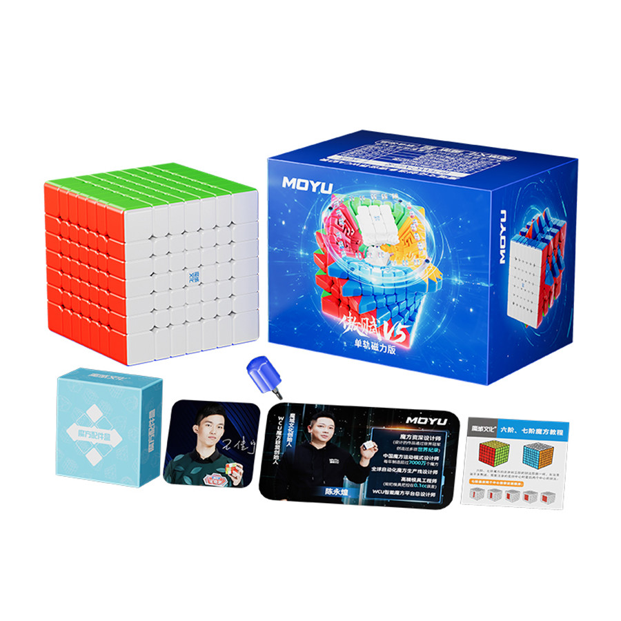 Moyu выпустила новую серию кубиков: базовую Single Track (с магнитами в углах и ребрах), Double Track (с замагниченной крестовиной) и Triple Track (со стандартными магнитами в углах и ребрах и с дополнительными магнитами внутри, с магнитной крестовиной). MoYu AoFu V5 (Single Track) M 7×7 — базовая модель для профессионалов, легко крутится и быстро, без заеданий, скользит и контролируется. Дополнительно может понадобиться подтянуть кубик, чтоб убрать расслабленность. Размер 7х7 всего 62 мм, вес 143 грамм, он очень быстрый и тактильный, ощущается разная сила магнитов на внешних и внутренних слоях, детали не заедают и не вылетают.